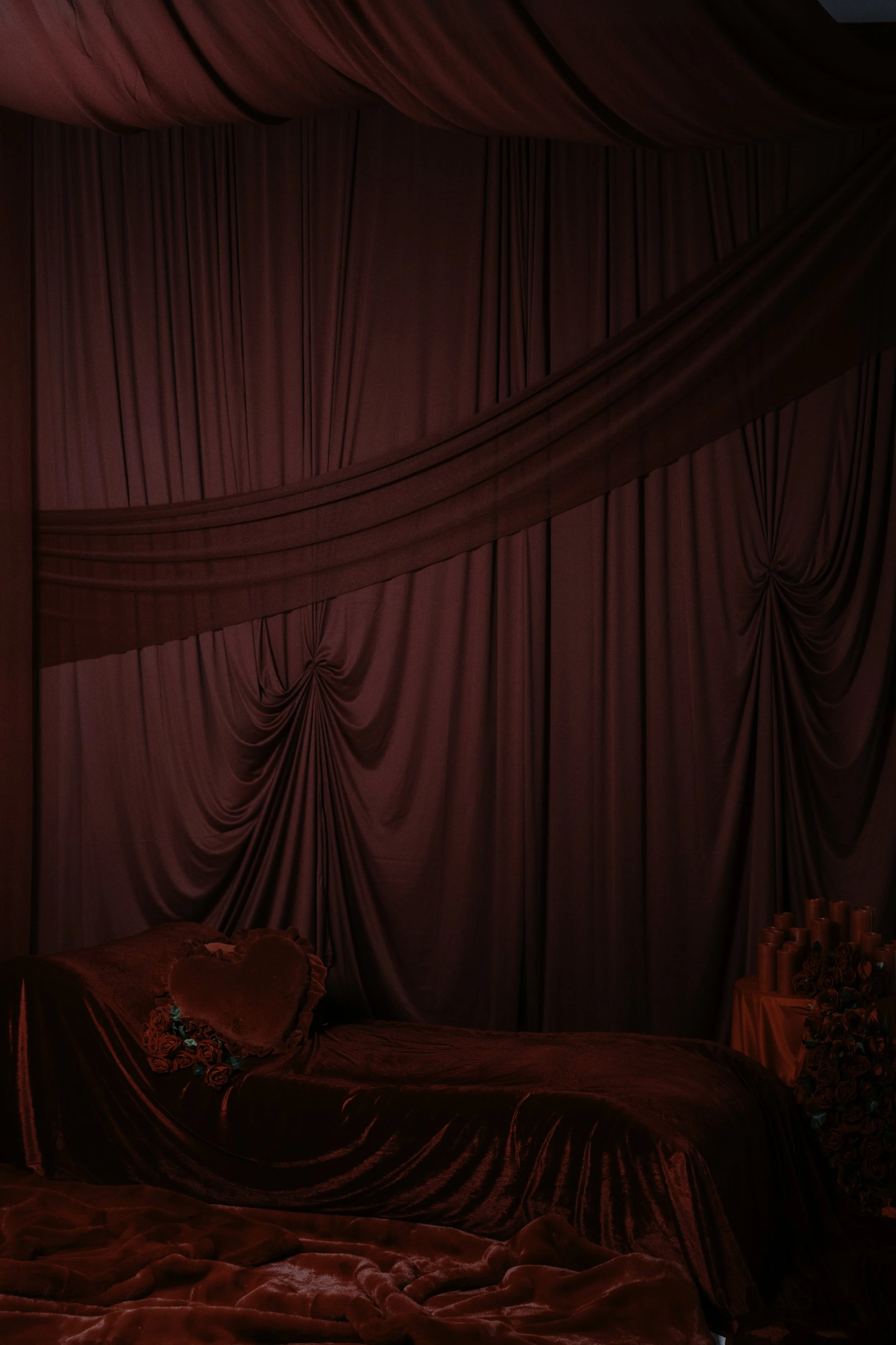 A set designed to make a statement. Featuring wine red draping from ceiling to floor, seating, florals, candles and more, capture the Valentine vibe with this gorgeously romantic set.