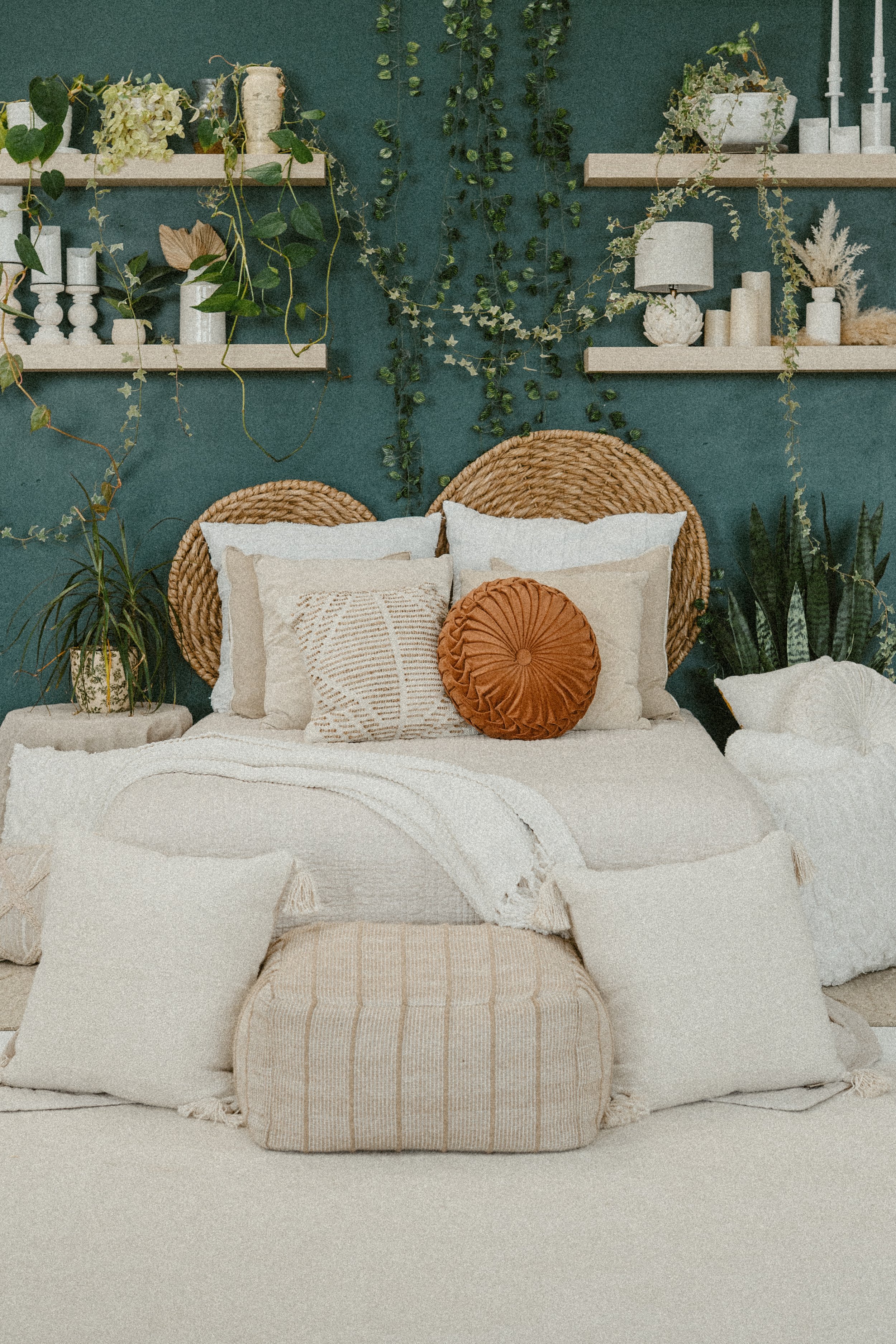 Positioning — Paired with an oversized off-white rug in front, this set provides the option for sitting on the bed, the fabric ottoman, or on the rug for a variety of posing options.